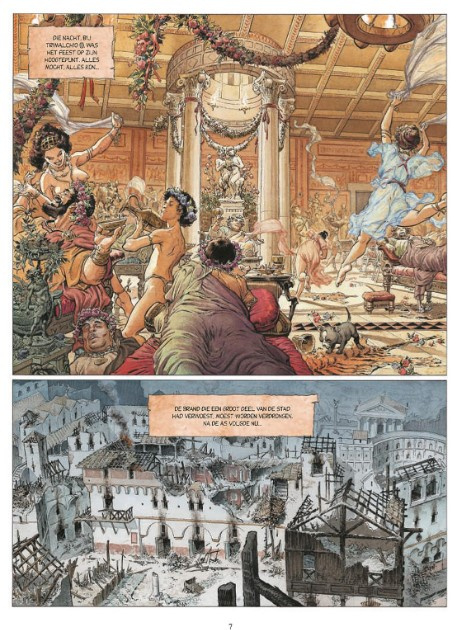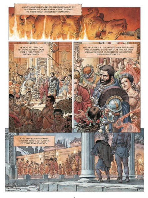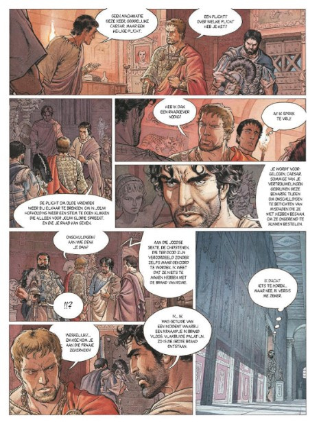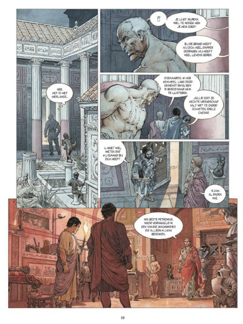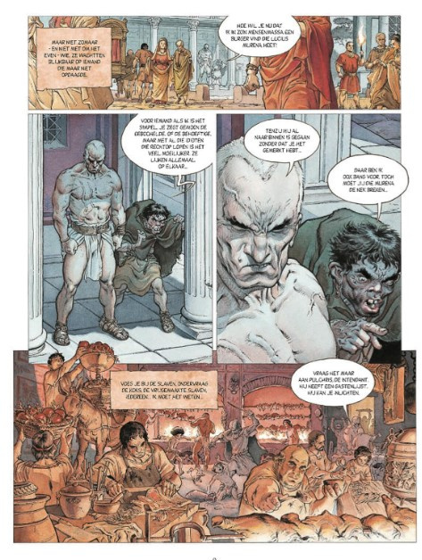 Toen we de eerste keer de cover van deze tiende Murena onder ogen kregen, zagen we direct de commerciële meerwaarde van deze keuze in. Reken maar dat hij zal opvallen in de rekken van jullie favoriete stripwinkel! En zo maakt ook de nieuwe tekenaar Theo Caneschi een opgemerkte entree langs de grote poort. Velen waren immers benieuwd hoe de opvolger van de betreurde Philippe Delaby het er vanaf zou brengen. Nu, Delaby was een fantastisch tekenaar en het is allesbehalve een sinecure om in zijn voetsporen te treden. We zijn er niettemin van overtuigd dat Caneschi een goed keuze is om deze reeks verder te zetten. Ook al zijn z'n hoofdjes een stuk karikaturaler dan die van zijn grote voorbeeld, we waren erg onder de indruk van zijn frivole overzichtsscènes. Voor de liefhebbers verschijnt er trouwens nog een op vijfhonderd exemplaren genummerde editie van dit album vol schetsen en karakterstudies: het ultieme bewijs dat de tekenaar zich degelijk heeft voorbereid op deze strip!