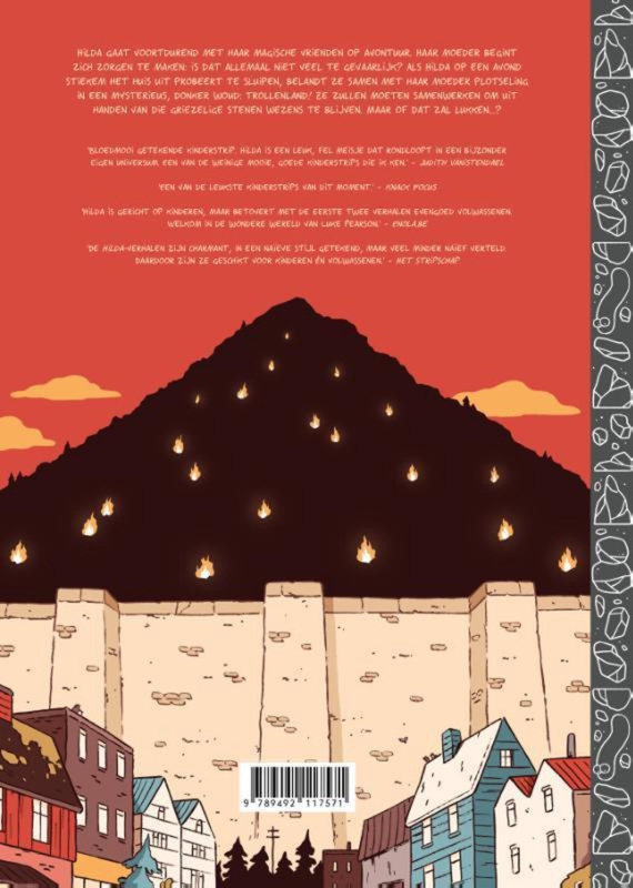 Hilda gaat voortdurend met haar magische vrienden op avontuur. Haar moeder begint zich zorgen te maken: is dat allemaal niet veel te gevaarlijk? Als Hilda op een avond stiekem het huis uit probeert te sluipen, belandt ze samen met haar moeder plotseling in een mysterieus, donker woud: trollenland! Ze zullen moeten samenwerken om uit handen van die griezelige stenen wezens te blijven. Maar of dat zal lukken...? 'Bloedmooi getekende kinderstrip. Hilda is een leuk, fel meisje dat rondloopt in een bijzonder eigen universum. Een van de weinige mooie, goede kinderstrips die ik ken.' - Judith Vanistendael 'Een van de leukste kinderstrips van dit moment.' - Knack Focus 'Hilda is gericht op kinderen, maar betovert met de eerste twee verhalen evengoed volwassenen. Welkom in de wondere wereld van Luke Pearson.' - Enola.be 'De Hilda-verhalen zijn charmant, in een naïeve stijl getekend, maar veel minder naïef verteld. Daardoor zijn ze geschikt voor kinderen én volwassenen.' - Het Stripschap