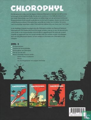 Na zijn geboorte in 1954 werd de dappere eikelmuis Chlorophyl al snel een van de favoriete personages uit het weekblad Kuifje. Na zijn eerste avonturen in het Stille Dal belandt hij in het stadje Notenschelp, waar hij het opnieuw te stellen krijgt met zijn aartsvijand Anthraciet. De gewetenloze schurk smeedt snode plannen om de macht te grijpen. Samen met zijn trouwe vriend Minimum probeert Chlorophyl daar natuurlijk een stokje voor te steken. De humor, vaart en prachtige tekeningen maken Chlorophyl een tijdloze strip voor lezers van 7 tot 77 jaar. In de driedelige integrale heruitgave zijn alle Chlorophyl-verhalen van Raymond Macherot bijeengebracht. Dit tweede deel bevat drie lange verhalen, waarvan er een, De Spoorpiraten, nooit eerder in zijn oorspronkelijke vorm als album is gepubliceerd. De strips zijn zo goed mogelijk teruggebracht naar hun oorspronkelijke staat. De verhalen worden voorafgegaan door een rijk geïllustreerd dossier, vol met weetjes en informatie over Chlorophyl én zijn schepper. Dit deel bevat: - De Spoorpiraten - Zizanion de Verschrikkelijke - De terugkeer van Chlorophyl - Pas op voor de verf! - Bonus: Grenadier Victoria vertelt...; Dokter Finet is verdwenen; Klaxon; De drie bergplaatsen van Langoor, het konijn