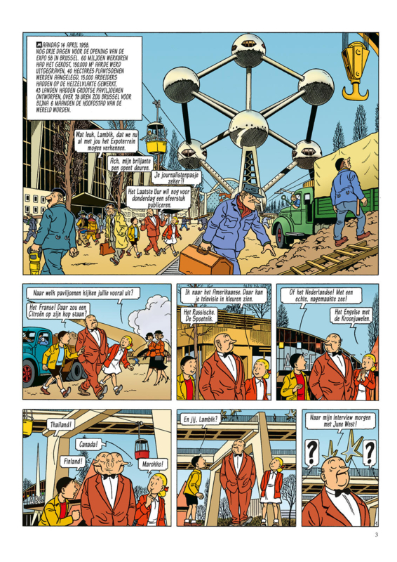 Maandag 14 april 1958; Lambik, Suske en Wiske wandelen blijgezind rond op de Heizelvlakte te Brussel. Vele prachtige paviljoenen kunnen nog een laatste likje verf gebruiken, hier en daar is er nog een extra spijker nodig, want over drie dagen zal de Expo ’58 officieel zijn deuren openen. Als journalist mag Lambik in avant-première de site bezoeken, om alvast sfeerindrukken aan de hoofdredactie te bezorgen, en zijn twee vrienden mogen hem vergezellen. Vooral Lambik is in de wolken want hij kreeg de opdracht om later die week de ravissante filmactrice June West te interviewen. Hij zweeft ook letterlijk want botst op een vreemde jongeman die duidelijk gehaast is. De vreemdeling vlucht weg, achternagezeten door twee mannen, maar steekt nog vlug een kaartspel in het vestzakje van Lambik. Suske ontdekt dat er drie kaarten ontbreken. Diezelfde avond wordt het kaartspel gestolen.