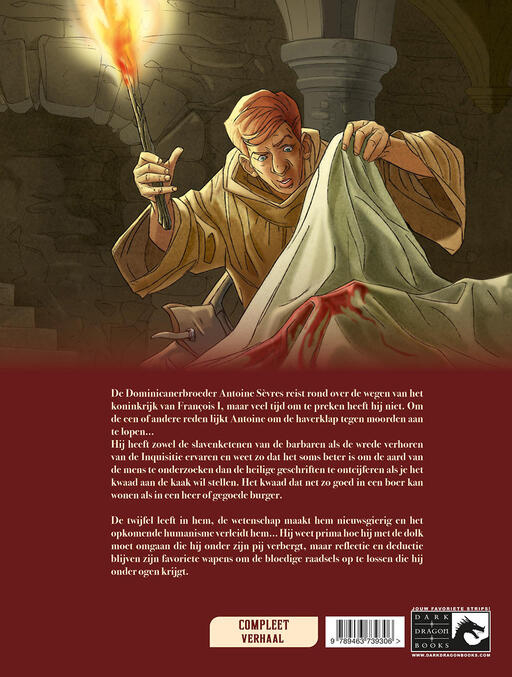 Broeder Dominicaan Antoine Sèvres doorkruist het koninkrijk van Frans I, Waar hij vaak verwikkelt raakt in de misdaden van zijn tijd. Hij heeft de martelwerktuigen van de barbaren en de inquisitie doorstaan en weet dat het soms beter is de aard van de mens te onderzoeken dan de heilige geschriften te ontcijferen om het kwaad aan de kaak te stellen. Vervuld van twijfel, nieuwsgierig naar de wetenschap, verleidt door het ontluikende humanisme, weet hij ook om te gaan met de dolk die hij onder zijn gewaad verbergt. Maar reflectie en deductie blijven zijn favoriete wapens om de bloedige raadsels op te lossen waarmee hij wordt geconfronteerd.