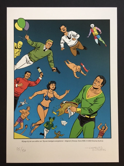 Charles Guthrie moet wel een van de best bewaarde geheimen van de Nederlandse strip zijn. Eindelijk is het absurdistische en zwarthumoristische werk van deze in Leeuwarden neergestreken Amerikaan, die onder andere in Zone 5300 publiceert, gebundeld in een mooie uitgave. Maak kennis met Guthrie’s surrealistische universum, dat wordt bevolkt door Dijkgraaf Dick, Ginger Infinity Homofoon Harry en de Wasemman; dat alles superieur getekend in de stijl van EC Comics en de oude superheldenstrips. Milan Hulsiung over het werk van Guthrie: “Tjemig, wat is die Guthrie toch goed! En je wilt altijd direct een douche nemen na het lezen van zijn werk!” Uitgave in samenwerking met Zone 5300.