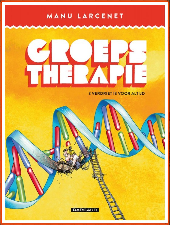 Groepstherapie is een schitterend verhaal van Manu Larcenet over een stripmaker – niemand minder dan Larcenet zelf – op zoek naar inspiratie. In een voortdurende zoektocht doorkruist hij de wereld van de creatie. Hij duikt de geschiedenis in, doet een oproep aan de grootste schilders, raadpleegt Boileau, Nietzsche en God Himself. Niet elke dichter kan humor met wanhoop rijmen, en toch slaagt Manu Larcenet net daarin met dit grappig, ontroerend en opzienbarend album. Hij maakt van elke tekening, elke pagina, elke tegenslag een hilarisch en aangrijpend moment. Tegenover de benauwing van de creatie plaatst hij zichzelf, naakt, zonder veinzerij of trukendoos. Hij trekt op een prachtige ontdekkingstocht, doordrongen van verrassende humor en een hartverscheurende waarheid op zoek naar de goddelijke inspiratie, of eender welke inspiratie, gewoon… al is het maar een miniem stukje inspiratie… iets… want zonder inspiratie is een kunstenaar niets. Manu Larcenet toont zich in Groepstherapie weer meester van de humor en creëert een unieke sfeer die je als lezer meteen meetrekt, recht naar de afgrond die gaapt voor de voeten van de inspiratieloze artiest.