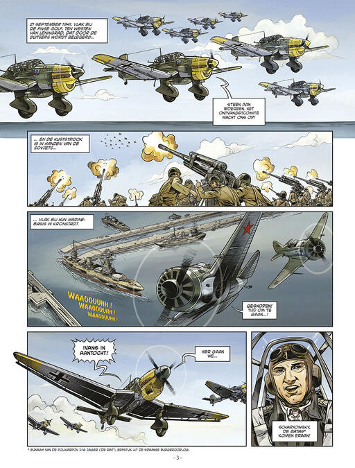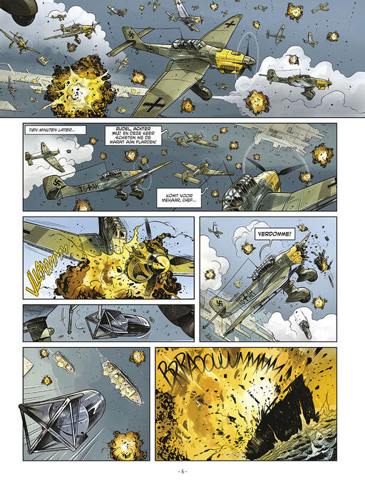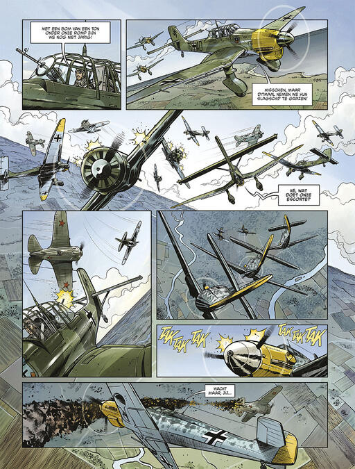 "Met de Ju 87 Stuka komt de dood vanaf 1939 uit de lucht gevallen, gekend om zijn angstwekkende sirene en zijn dodelijk nauwkeurige bommen. De ultieme versie van de Stuka, aan het Oostfront, is de antitank Ju 87G, met zijn genadeloze kanonnen. De naam Hans-Ulrich Rudel is onlosmakelijk verbonden met dit vliegtuig. Rudel is de meest gedecoreerde Duitse soldaat van de oorlog en het is Stalin zelf die een prijs op zijn hoofd zet. De geallieerden weigeren deze overtuigde nazi aan hem over te leveren, want hij is ook een voorbeeldig strijder, die veel respect geniet van zijn tegenstander. Dit complete verhaal is geïnspireerd op de wapenfeiten van deze held met het sombere gezicht..."