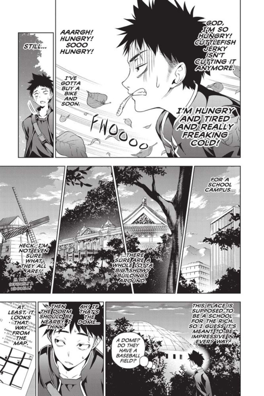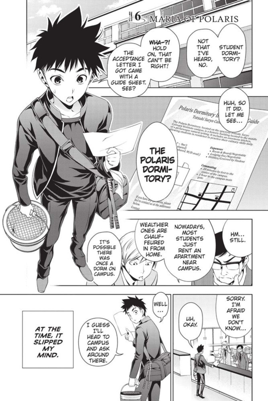 Leaving home for the first time in his young life, Soma moves into the school's Polaris Dormitory - a place run by an old crone and filled with crazy and eccentric students! Barely settled in, Soma quickly finds himself in one of Tohzuki's legendary cooking duels - a shokugeki! Who will his very first opponent be?